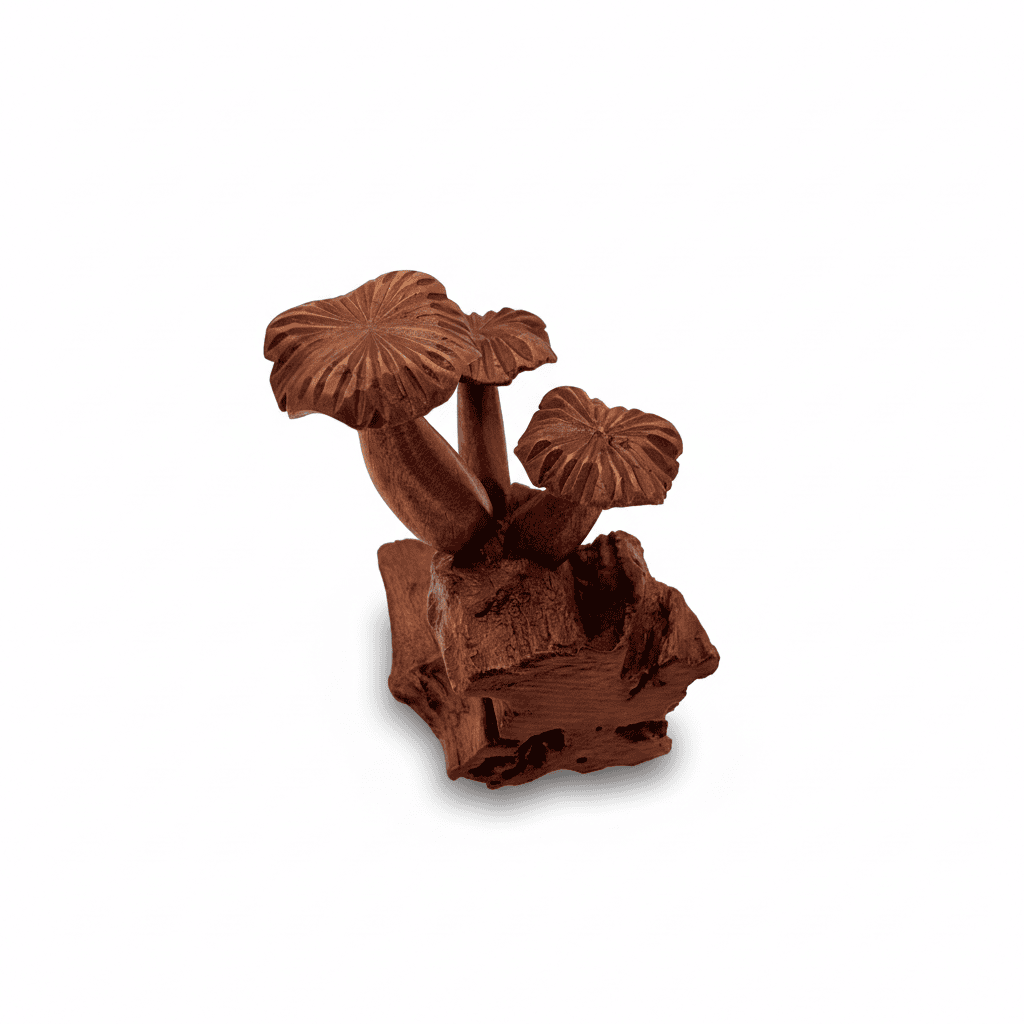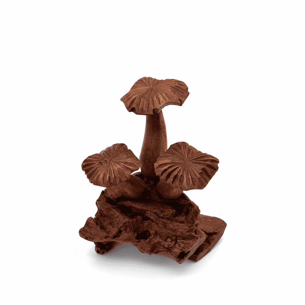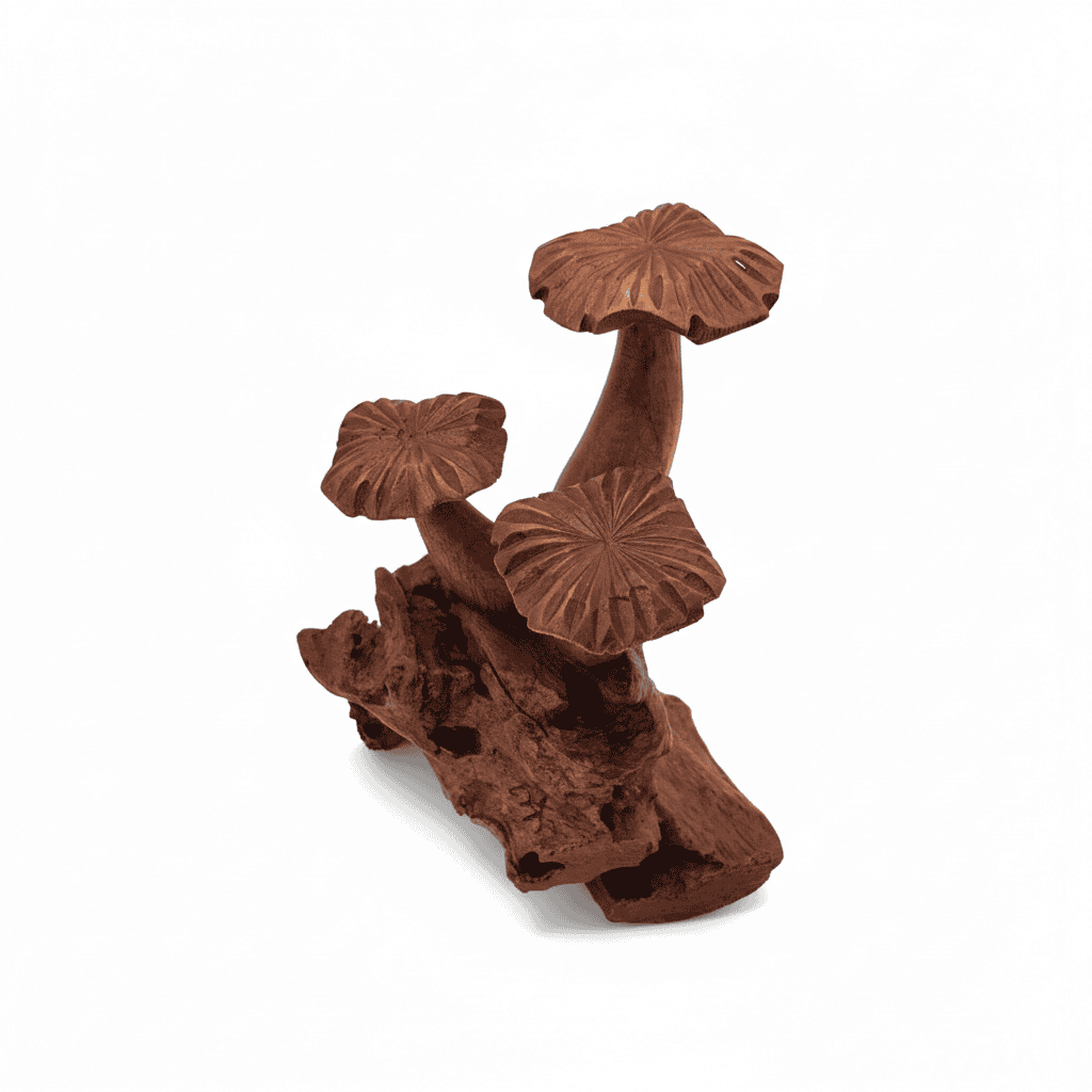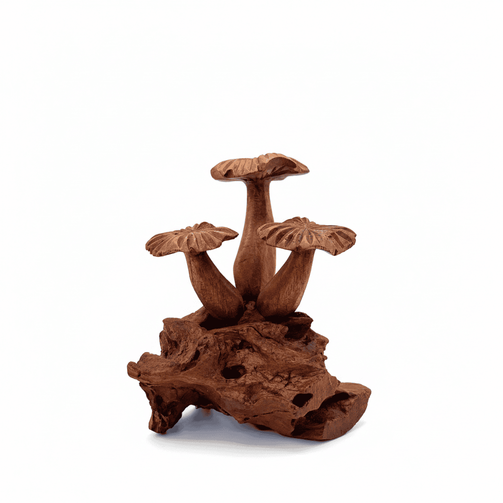 Bring woodland charm into your home with our Forest Bloom Wooden Mushroom Sculpture. Hand-carved from solid natural wood, this piece features three delicately detailed mushrooms rising from a textured forest-style base. The warm natural finish and fine carving make it a beautiful accent for shelves, desks or nature-inspired interiors.